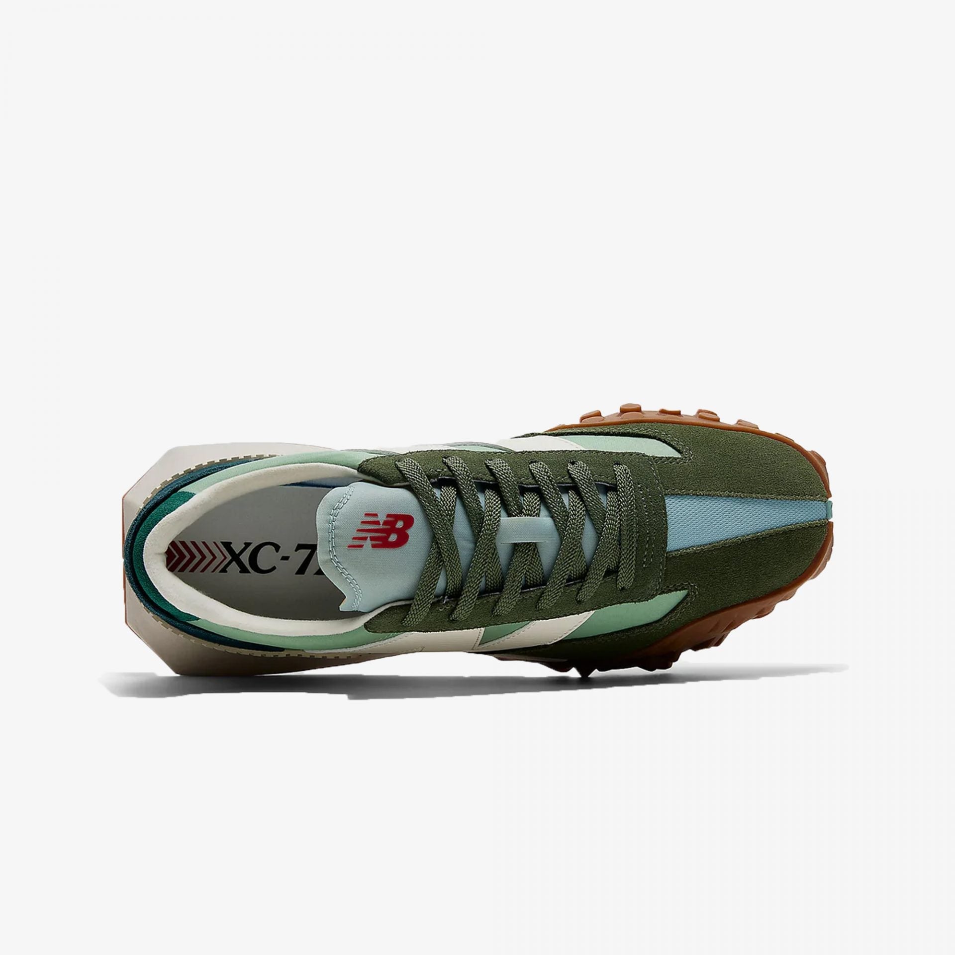 The sneakers shown in the image are the XC-72 model in the colorway named "Dry Sage/Norway Spruce" (style code UXC72OU1). This style features a multi-toned upper with panels of light mint green, a darker olive green, and off-white/cream accents, all set upon a distinctive gum rubber outsole.